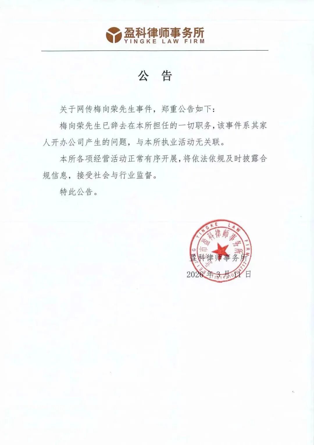 3月11日,北京市盈科律师事务所(下称“盈科律所”)掌门人梅向荣被指挪用律师费对外融资并违规担保的传闻迅速发酵,网传融资金额达到40亿元。当日夜间,盈科律所发布公告称,梅向荣已辞去在该所担任的一切职务,并表示:“该事件系其家人开办公司产生的问题,与本所执业活动无任何关联。”
